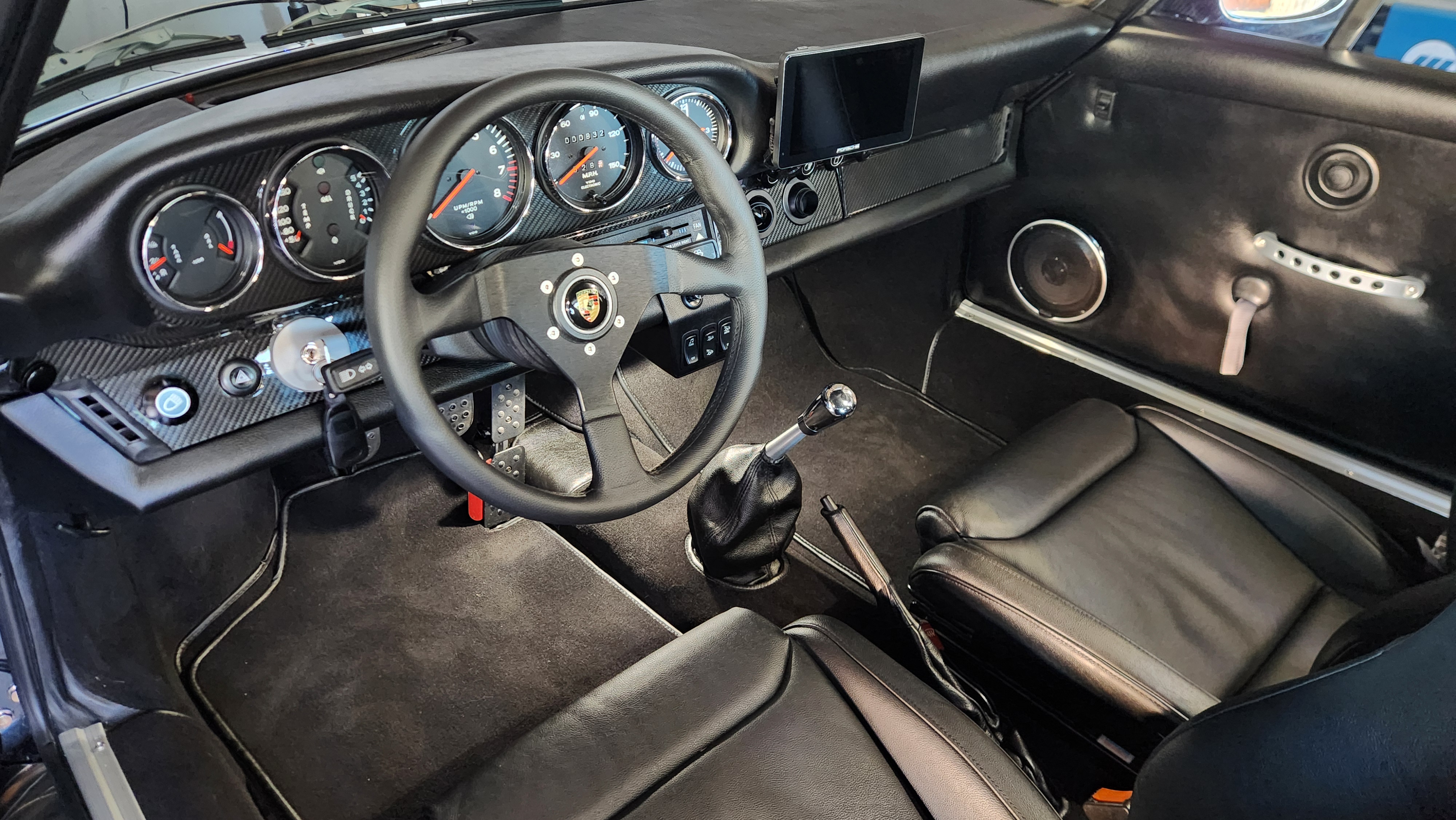 On the inside, the cabin houses Recaro Sportster seats accompanied by a MOMO steering wheel. The VDO instrumentation was restored by Hollywood Speedo. Rennline Peddles and knobs were added. A polished stainless rollbar by Elfer-Art and a rear seat delete was installed. The Interior was finished by OB upholstery.